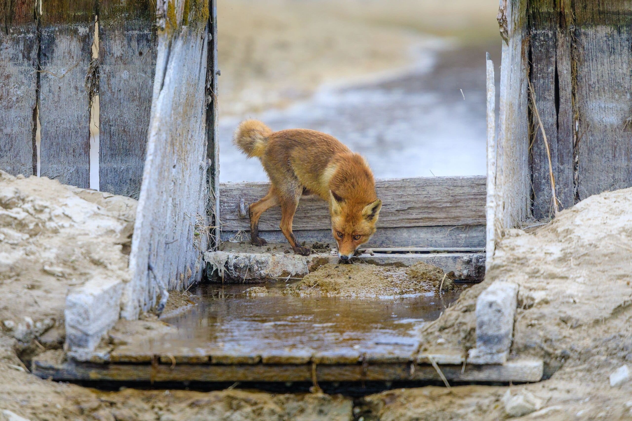 Wat dan eigenlijk heel leuk is dat vosjes als rasechte opportunisten zich op geen enkele manier door onze aanwezigheid liet afleiden. Onze rugzakken werden net zo terloops besnuffeld als de polletjes omwoeld mos of de scheuren tussen de ingedroogde klei. En zo is een vos die zich keurig laat lenen voor een workshop vossenfotografie tegelijkertijd ok weer wild genoeg om zich er allemaal niet veel van aan te trekken als het niet in haar directe voordeel is. Achja – ze zal op die regenachtige dagen als er geen hond komt opdagen ook voor eten op de plank moeten zorgen.
