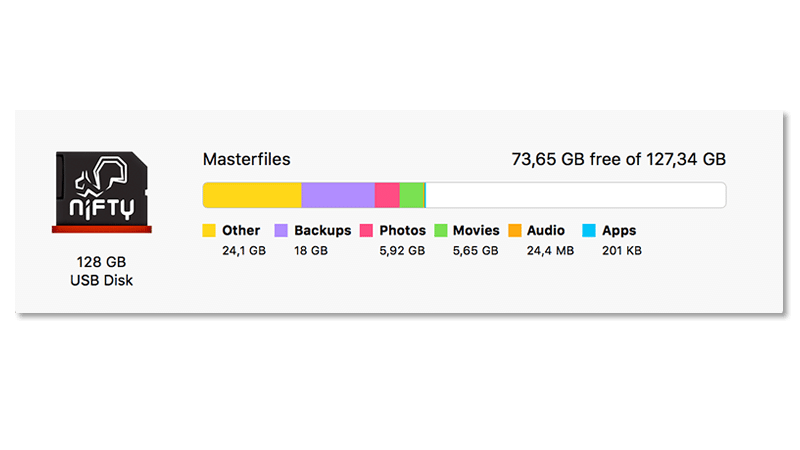 Gebruik de Nifty voor je muziek en films, je iOS fotobibliotheek, voor de Dropbox-bestanden die je onderweg moet kunnen gebruiken, je Google Drive. Zo hou je je systeemdisk ‘lean and mean’.