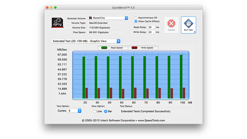 De leessnelheid van de SD-card is 70MB/s maar de schrijfsnelheid een stuk lager. Gebruik de Nifty dus niet als opslag voor zaken die doorlopend gelezen en geschreven moeten worden.